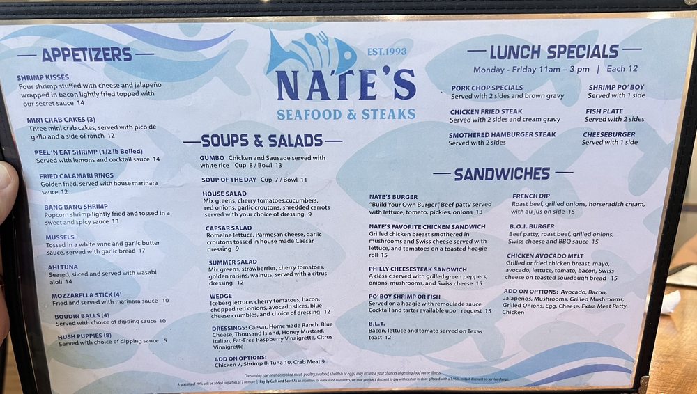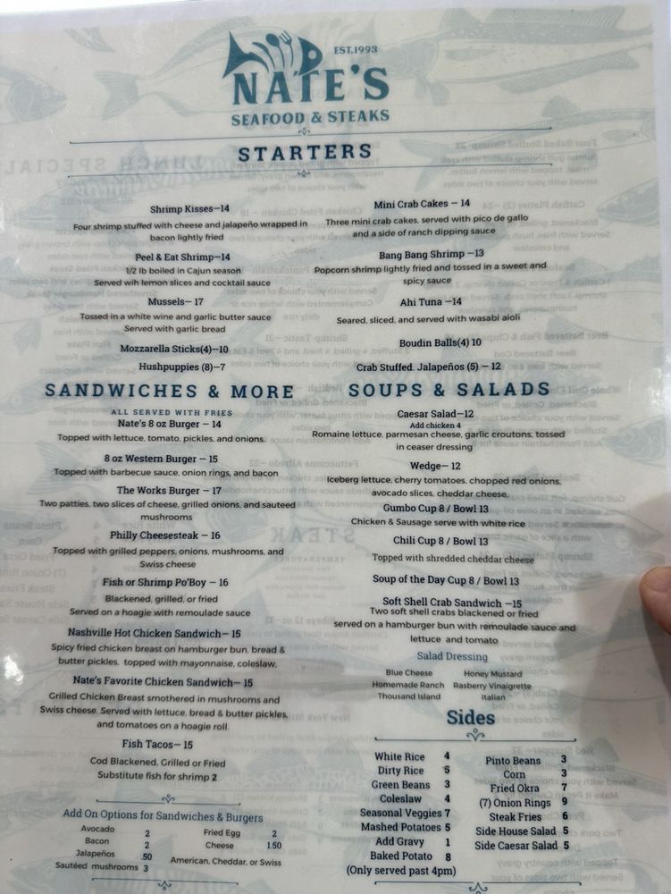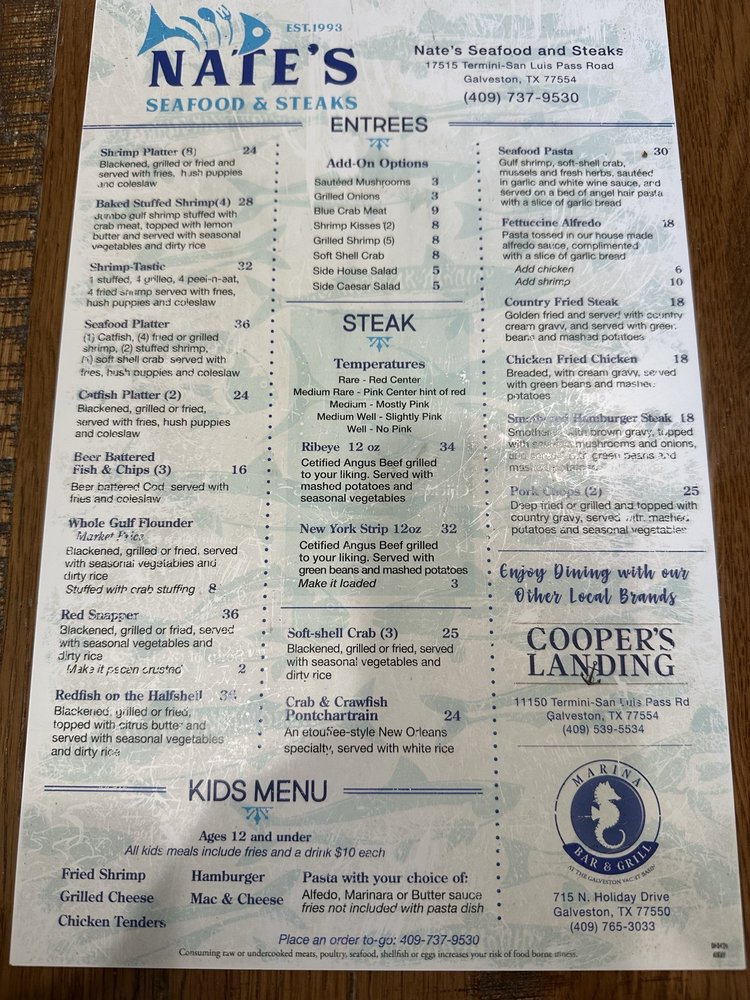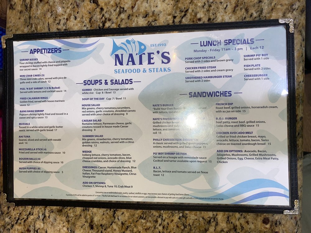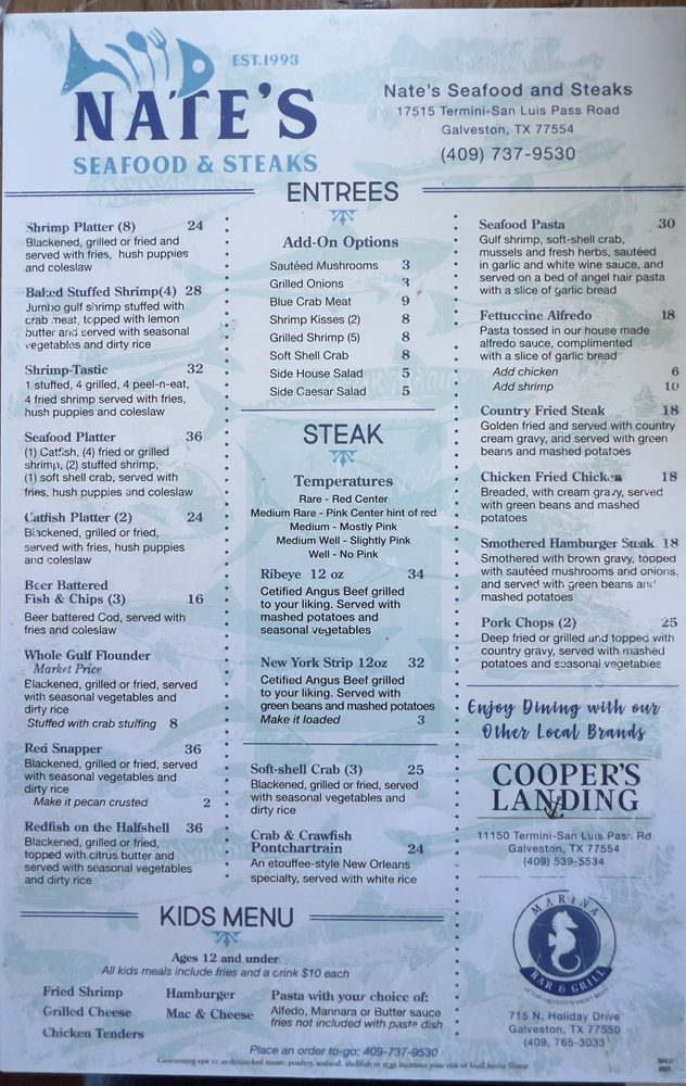 Whether dining indoors or enjoying the welcoming outdoor seating, expect attentive service and a relaxed atmosphere perfect for families and groups alike. The restaurant is wheelchair accessible and even welcomes furry friends on the patio. With the added convenience of takeout, delivery, and catering options, Nate's West End ensures a delightful experience for everyone. Don’t miss their happy hour specials—every visit here feels like a warm embrace from Galveston's culinary scene.